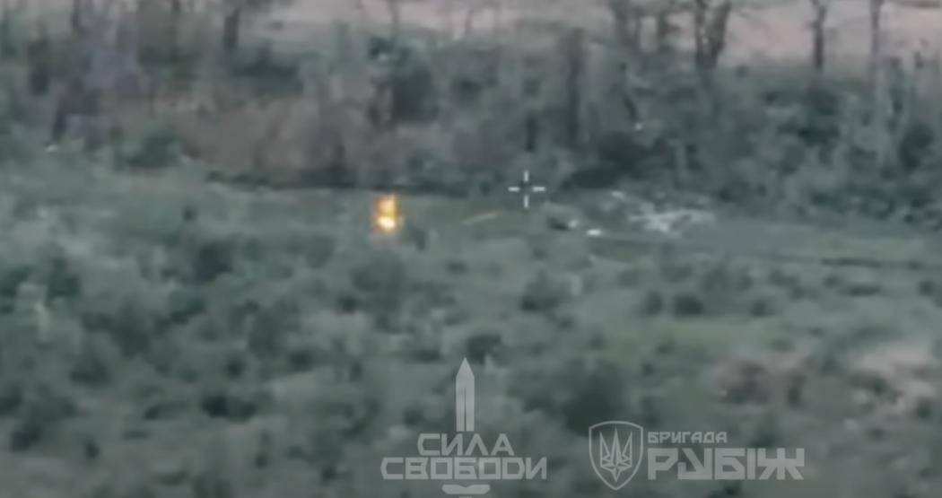 乌方发布的视频显示,“坦克手”在拿到自行车前行仅几百码后触雷。 图源:乌方发布视频截图