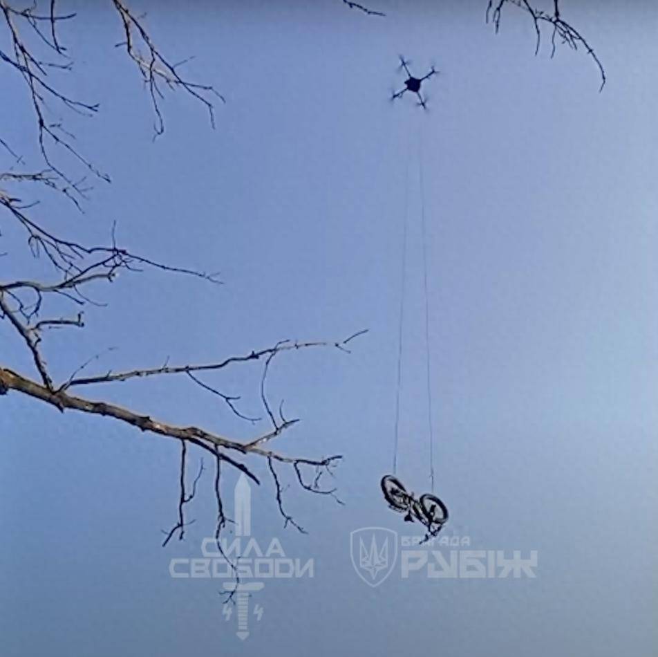 乌方发布的视频显示,无人机正投下一辆电动自行车。 图源:乌方发布视频截图