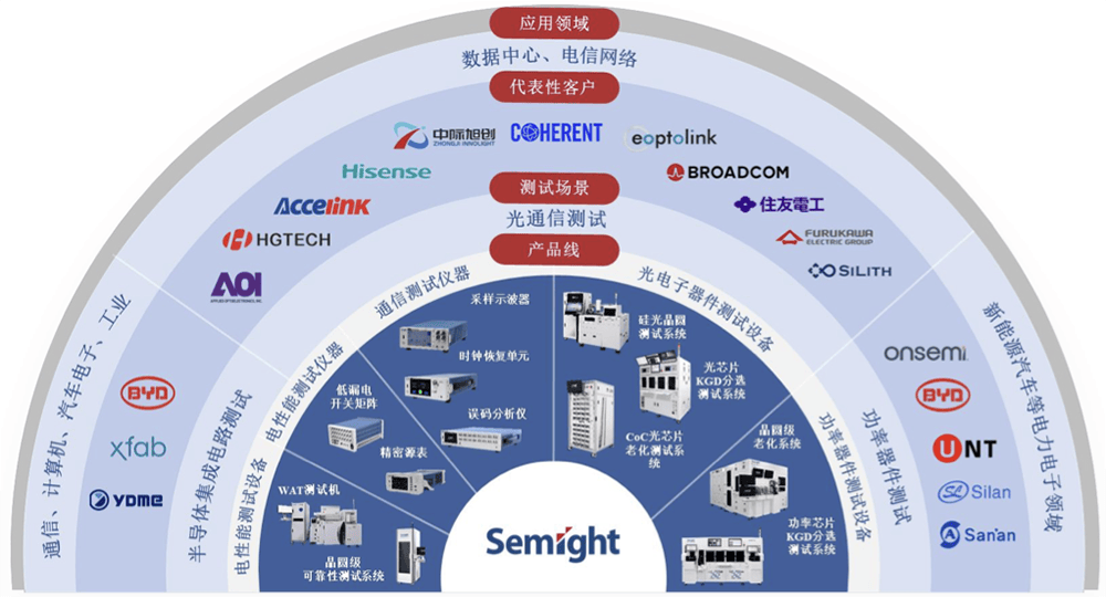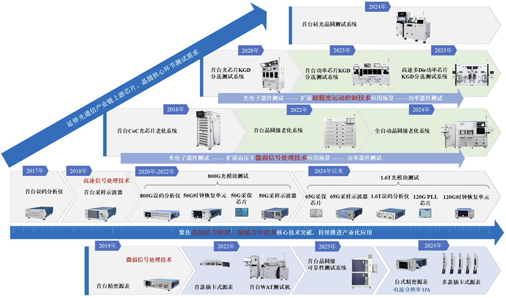 依托平台级核心技术体系,联讯仪器不断巩固和深化在光通信领域的纵向竞争力,并实现在功率器件、半导体集成电路等领域的横向拓展,形成了丰富的产品矩阵。