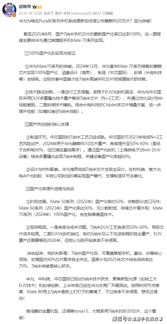 那么现如今亮牌的底气则是国产化率已大幅度突破,甚至可以说供应链全链路自主可控,使华为无需再担忧“说漏嘴殃及伙伴”的风险。