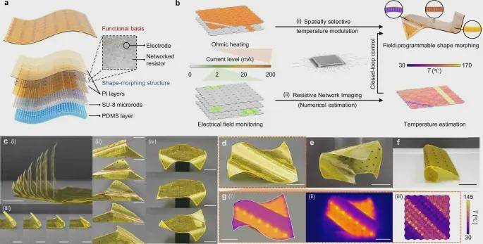 研究团队选用热塑性高分子薄膜材料作为载体,在其表面构建一张可寻址的电阻网络阵列,该阵列既可发热,又能实时感知温度,为精确控制折叠状态提供了硬件基础。