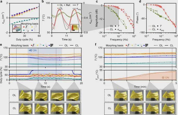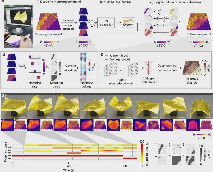研究团队运用电阻网络成像(RNI)作为温度检测的核心手段,结合比例-积分(PI)控制算法和现场可编程门阵列(FPGA)驱动的电子设备,形成“测量-反馈-调节”的闭环链路。其核心逻辑是通过实时监测折叠片的温度分布,动态调整电热刺激参数,使实际温度与目标温度保持一致,进而精确控制折叠曲率。