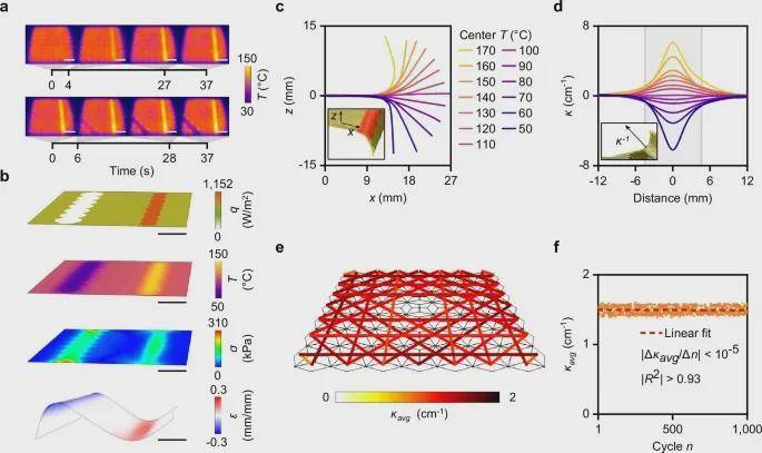 由于电热形状变形机制采用双层结构,使得不同层结构之间存在热膨胀不匹配的风险。考虑到该情况,研究团队在各种材料中选择了一堆聚酰亚胺(PI)和聚二甲基硅氧烷(PDMS)可以提供较大的曲率响应度。