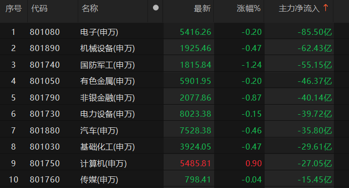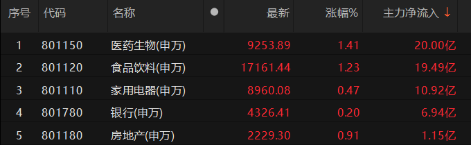 截至8月19日10时50分,申万一级行业板块中,主力资金净流入医药生物、食品饮料、家用电器等板块,其中,医药生物板块净流入达20亿元。主力资金净流出电子、机械设备等板块,其中,电子板块净流出超85亿元。