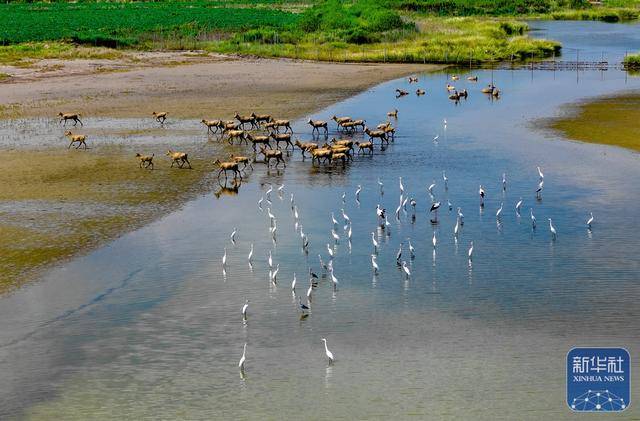 ↑ 9月15日,候鸟与麋鹿在江苏东台条子泥湿地栖息、觅食(无人机照片)。新华社发(孙家录摄)