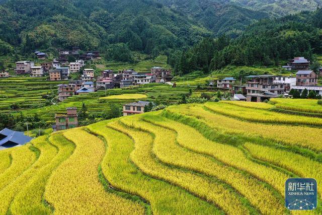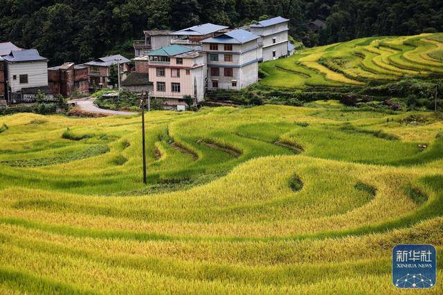 ↑ 9月15日拍摄的广西融水苗族自治县同练瑶族乡朋平瑶寨与梯田。新华社发(龙林智摄)