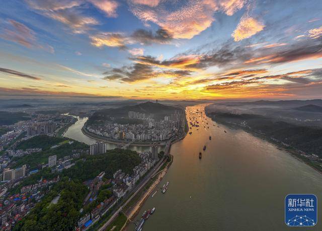 ↑ 9月16日清晨在广西梧州拍摄的西江水域朝霞(无人机照片)。新华社发(何华文摄)
