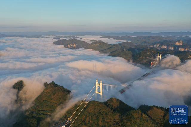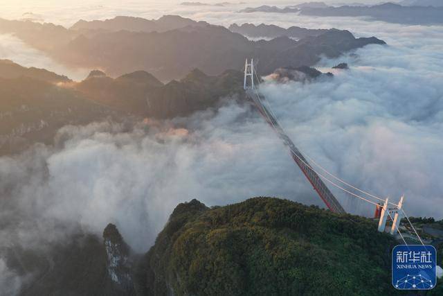 ↑ 9月16日清晨拍摄的湖南省湘西土家族苗族自治州吉首市矮寨特大悬索桥(无人机照片)。新华社发(刘振军摄)