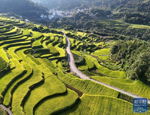 ↑ 9月15日拍摄的浙江省乐清市白石街道中雁村山间梯田(无人机照片)。新华社发(蔡宽元摄)