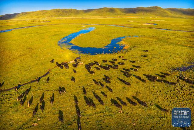 ↑ 9月13日,在四川阿坝县,牧民赶着牛群牧归(无人机照片)。新华社发(米林摄)