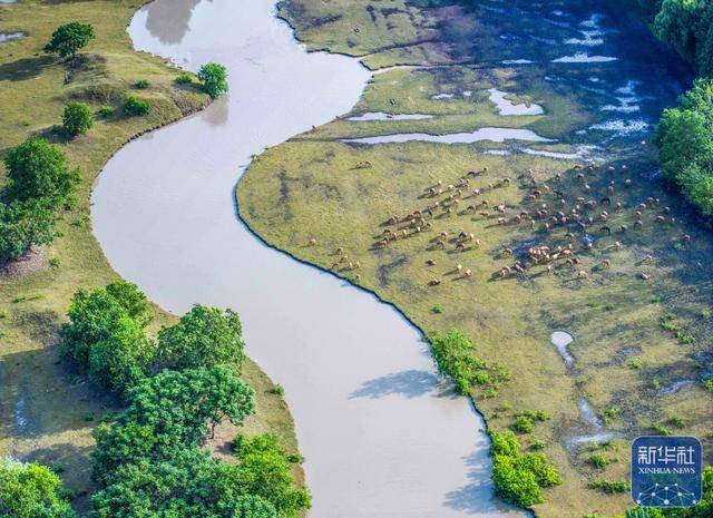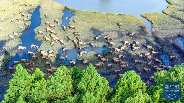↑ 9月11日,在江苏省泰州市姜堰区溱湖国家湿地公园,一群麋鹿在觅食、嬉戏(无人机照片)。新华社发(周社根摄)
