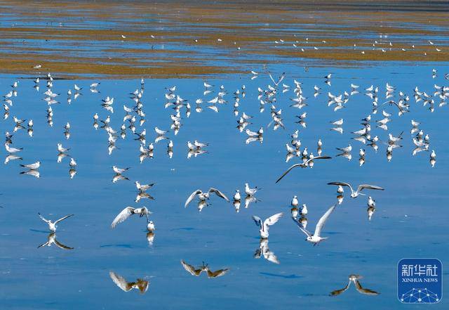 ↑ 9月15日,候鸟在江苏东台条子泥湿地栖息、觅食(无人机照片)。新华社发(孙家录摄)