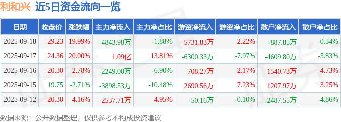 证券之星消息,利和兴9月18日涨停收盘,收盘价29.23元。该股于10点11分涨停,10次打开涨停,截止收盘封单资金为2540.97万元,占其流通市值0.46%。