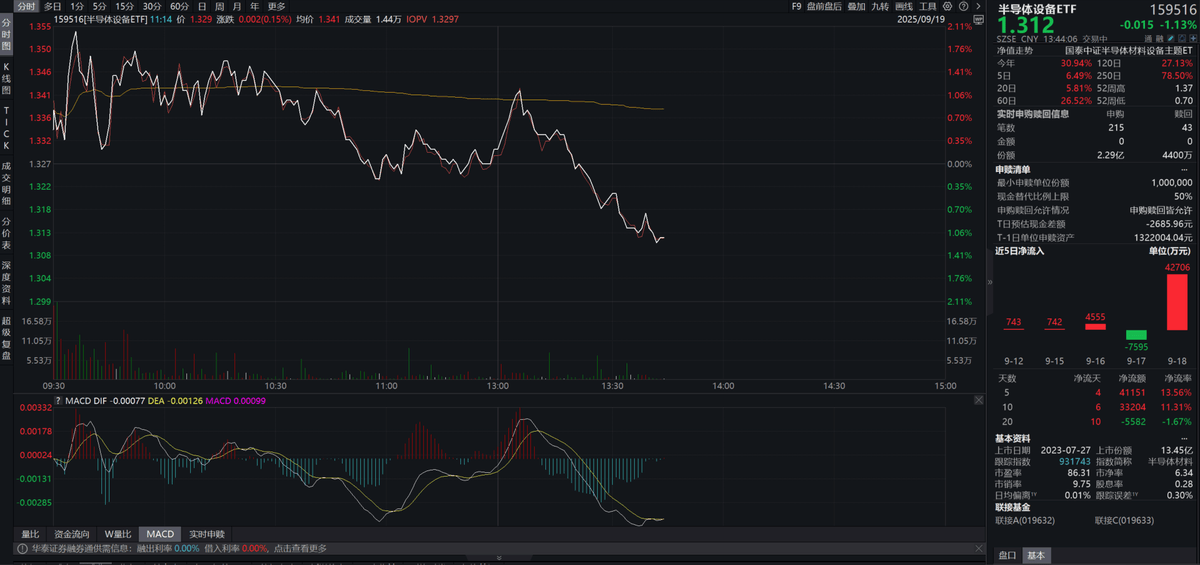 国产替代中,上游半导体设备是核心,当前半导体设备ETF(159516)盘中由涨转跌,回调或为布局机会。资金逢低抢筹,盘中实时流入超2亿份,当前规模超36亿元,位居细分品类首位,流动性占优。