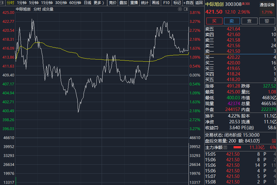 值得关注的是,在尾盘集合竞价时段,部分股票大幅异动,中际旭创从上涨1.49%的位置拉升至上涨2.96%,药明康德从下跌0.53%的位置拉升至上涨1.23%。此外,新易盛、百济神州拉升近1个百分点。