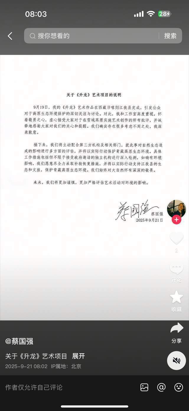 21日,蔡国强抖音账号发布关于《升龙》艺术项目的说明,全文如下: