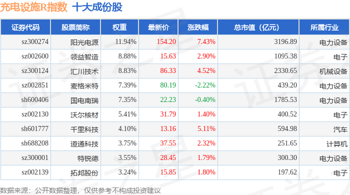 证券之星消息,9月24日,充电设施R(480077)指数报收于4201.9点,涨2.04%,成交616.97亿元,换手率4.57%。当日该指数成份股中,上涨的有31家,阳光电源以7.43%的涨幅领涨,下跌的有15家,万马股份以9.24%的跌幅领跌。