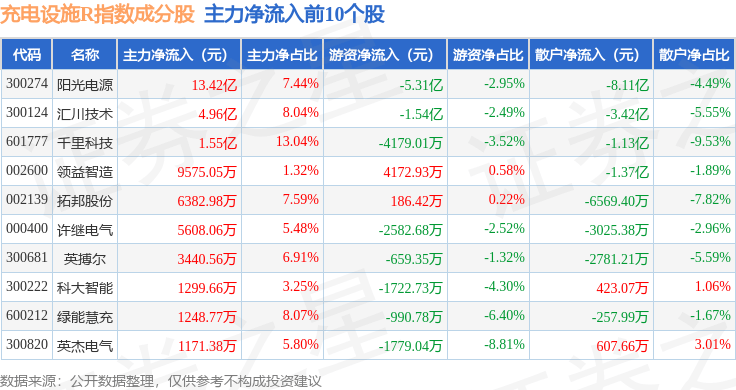 资金流向方面,充电设施R(480077)指数成份股当日主力资金净流入合计7.84亿元,游资资金净流出合计5.48亿元,散户资金净流出合计2.36亿元。成份股资金流向详情见下表: