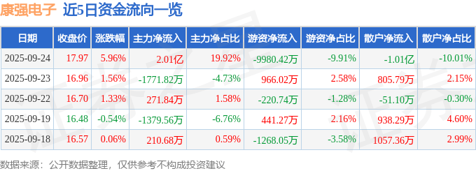 证券之星消息,截至2025年9月24日收盘,康强电子(002119)报收于17.97元,上涨5.96%,换手率15.3%,成交量57.43万手,成交额10.07亿元。