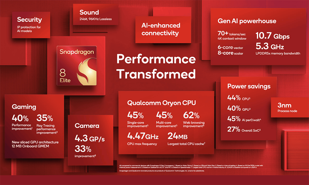 与CPU、GPU优化相结合,第五代骁龙8至尊版可智能管理各种工作负载,甚至能进一步提升NPU性能,支持生成式AI、图像处理、实时翻译、AI加速摄影和视频等应用。