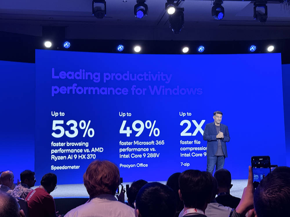 在提升生产力方面,该芯片可实现高达53%的更快浏览速度、49%的办公效率提升,以及比竞品快2倍以上的文件压缩速度。