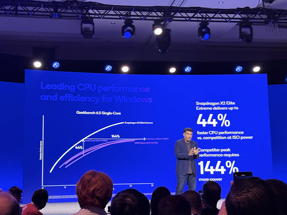 相比竞品,在同样功耗下,骁龙X2 Elite Extreme的CPU单核性能提升44%。竞品实现的同样任务处理,需要多用144%的功耗。