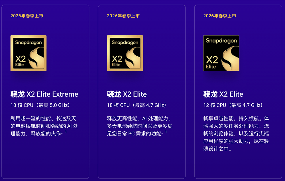 搭载骁龙X2 Elite的终端预计将于2026年春季上市。
