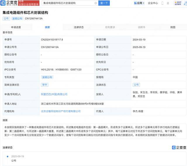 企查查APP显示,近日,阿里巴巴(中国)有限公司“集成电路组件和芯片封装结构”专利公布。企查查专利摘要显示,所述集成电路组件包括:第一晶圆裸片,形成有多个运算单元,所述多个运算单元用于并行地执行逻辑运算;第二晶圆裸片,与所述第一晶圆裸片叠置,所述第二晶圆裸片中形成有多个访问控制单元;其中,每个运算单元对应于所述多个访问控制单元,每个运算单元向至少一个访问控制单元分别发送至少一个数据访问指令,使每个访问控制单元响应对应的数据访问指令来执行数据访问。本发明的实施例提升了数据访问效率。
