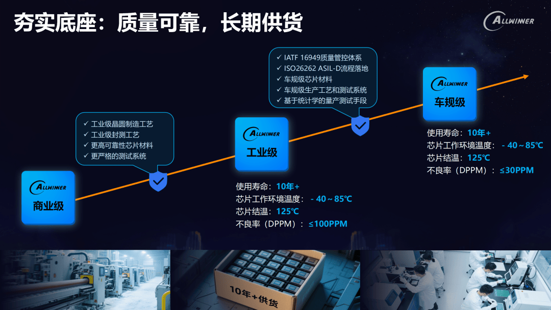 正如全志科技工业车载事业部副总经理皮杰勇在日前举办的“全志工业2.0战略发布会”上的演讲中所说:“历经多年的深耕细作,全志已建成 '全面工业级、部分车规级' 的芯片质量体系,产品市场端的不良率表现已全面 '进百’ ,获得工业、车载头部客户的肯定。”