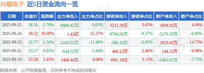 证券之星消息,截至2025年9月25日收盘,兴福电子(688545)报收于38.26元,下跌2.7%,换手率32.05%,成交量23.36万手,成交额9.23亿元。