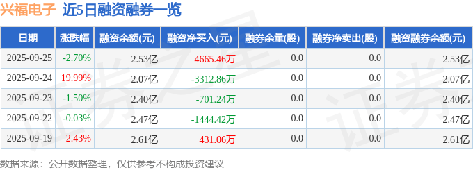 兴福电子融资融券信息显示,融资方面,当日融资买入1.36亿元,融资偿还8983.38万元,融资净买入4665.46万元。融券方面,融券卖出0.0股,融券偿还0.0股,融券余量0.0股,融券余额0.0万元。融资融券余额2.53亿元。