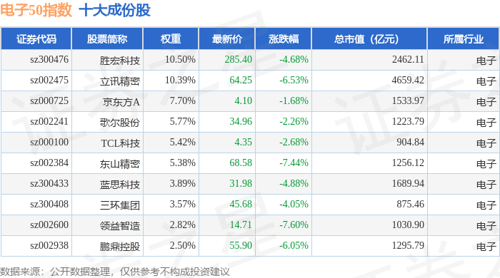 电子50(399281)指数十大成份股详情如下: