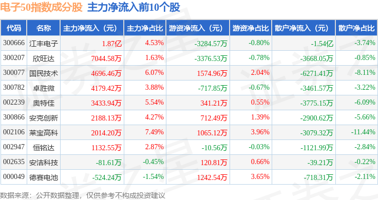 资金流向方面,电子50(399281)指数成份股当日主力资金净流出合计133.36亿元,游资资金净流入合计31.21亿元,散户资金净流入合计102.15亿元。成份股资金流向详情见下表:
