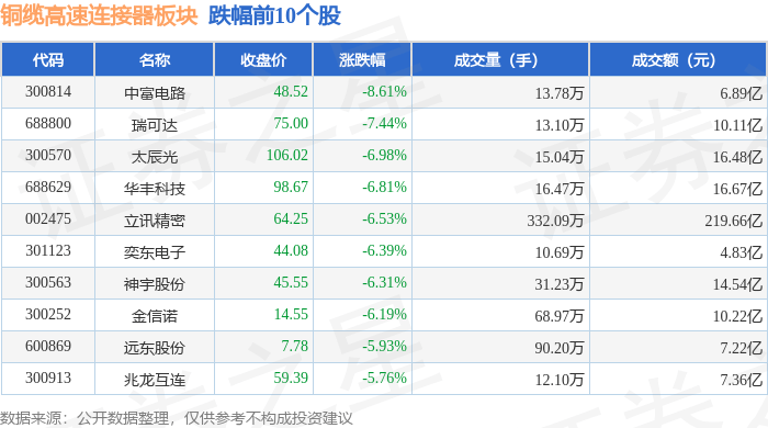 从资金流向上来看,当日铜缆高速连接器板块主力资金净流出67.13亿元,游资资金净流入13.82亿元,散户资金净流入53.31亿元。铜缆高速连接器板块个股资金流向见下表: