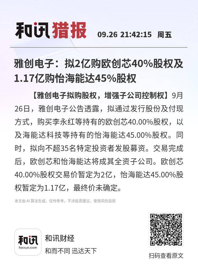【雅创电子拟购股权,增强子公司控制权】9月26日,雅创电子公告透露,拟通过发行股份及付现方式,购买李永红等持有的欧创芯40.00%股权,以及海能达科技等持有的怡海能达45.00%股权。同时,拟向不超35名特定投资者发股募资。交易完成后,欧创芯和怡海能达将成其全资子公司。欧创芯40.00%股权交易价暂定为2亿,怡海能达45.00%股权暂定为1.17亿,最终价未确定。