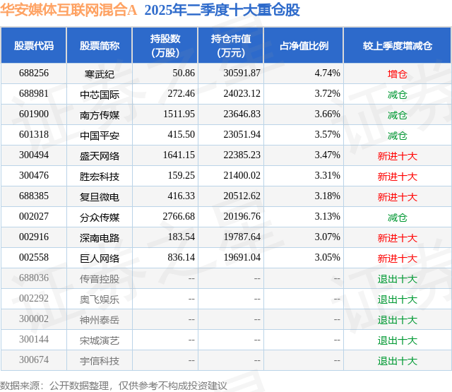 华安媒体互联网混合A的前十大重仓股如下: