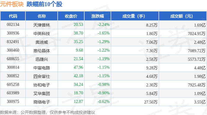 证券之星消息,9月29日元件板块较上一交易日上涨2.9%,深南电路领涨。当日上证指数报收于3862.53,上涨0.9%。深证成指报收于13479.43,上涨2.05%。元件板块个股涨跌见下表: