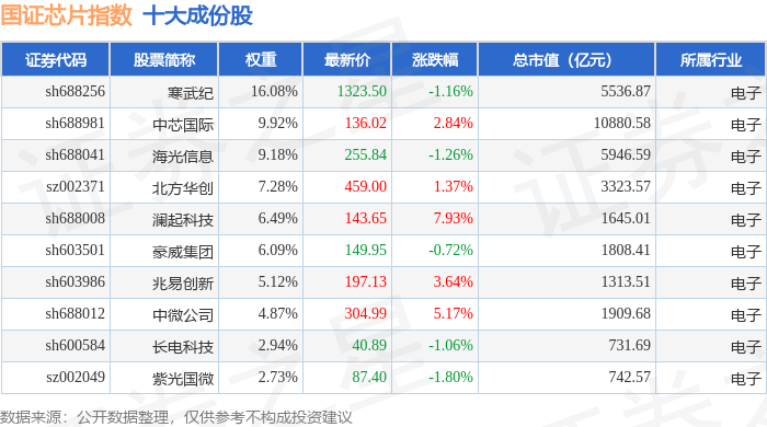 证券之星消息,9月29日,国证芯片(980017)指数报收于13649.87点,涨1.3%,成交1131.6亿元,换手率3.17%。当日该指数成份股中,上涨的有16家,盛美上海以9.99%的涨幅领涨,下跌的有13家,紫光国微以1.8%的跌幅领跌。