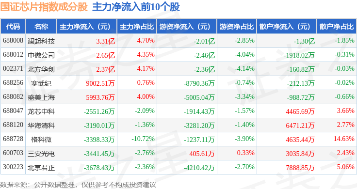 资金流向方面,国证芯片(980017)指数成份股当日主力资金净流出合计34.18亿元,游资资金净流入合计8.65亿元,散户资金净流入合计25.53亿元。成份股资金流向详情见下表: