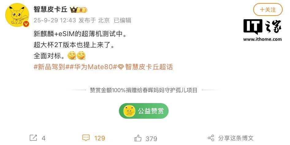 IT之家 9 月 30 日消息,博主 @智慧皮卡丘 发文,透露搭载“全新麒麟芯片和 eSIM 的超薄手机”正在测试中,相应机型将提供“超大杯”2TB 版本,号称“全面对标”,预计该机系华为旗下产品,将对标同样超薄定位的苹果 iPhone Air。