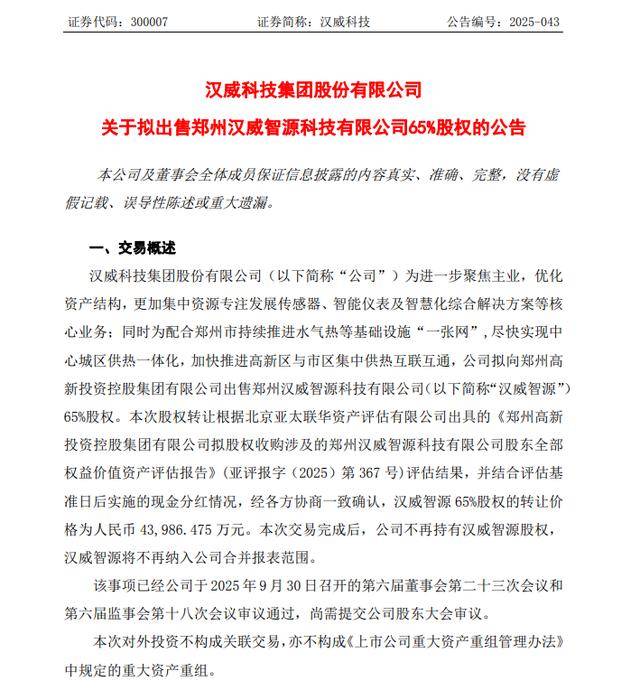 9月30日,汉威科技(300007.SZ)公告称,为进一步聚焦主业,优化资产结构,公司拟向郑州高新投资控股集团有限公司出售郑州汉威智源科技有限公司65%股权,转让价格为43,986.475万元。