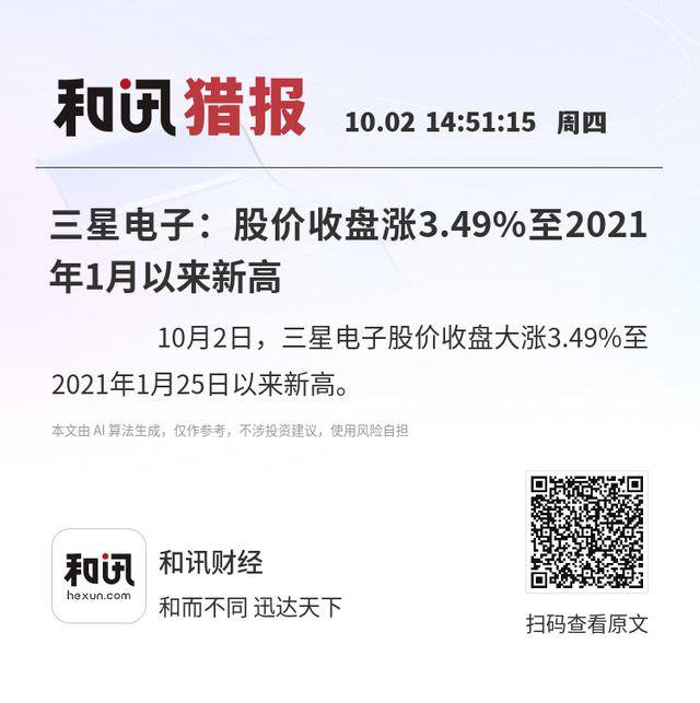 10月2日,三星电子股价收盘大涨3.49%至2021年1月25日以来新高。