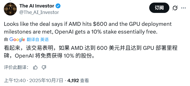 看起来,该交易表明,如果AMD股价达到600美元并且达到GPU部署里程碑,OpenAI将免费获得10%的股份。