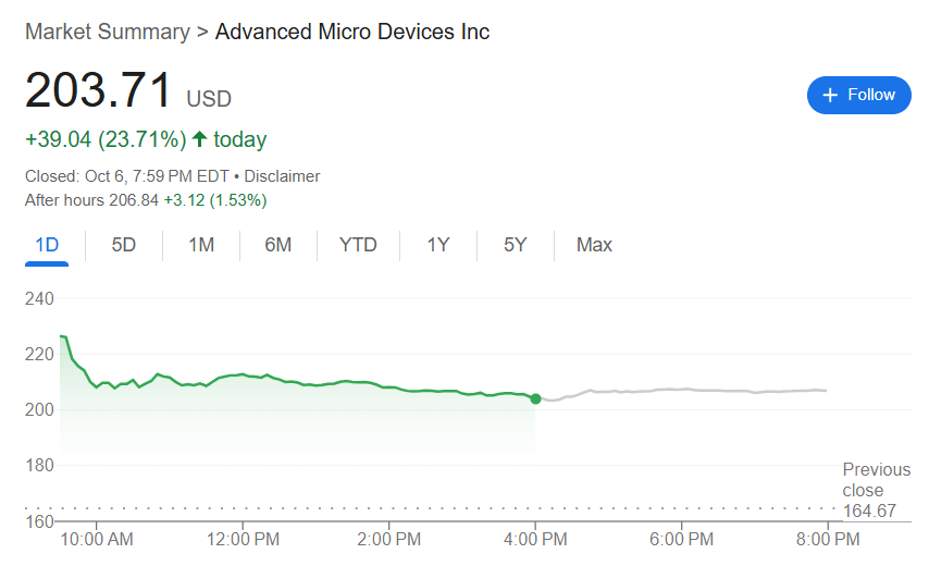 即使考虑股权稀释,6吉瓦需求给AMD带来的企业价值提升远超新增股份发行的影响。消息发布后,AMD周一股价飙升近24%。