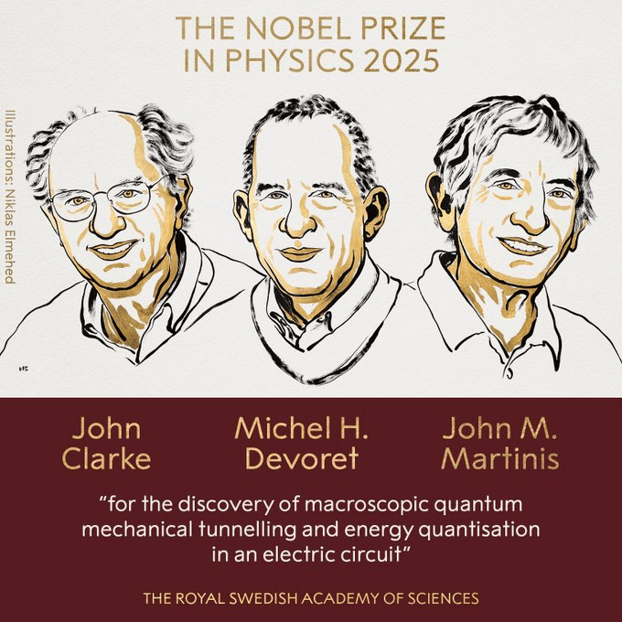 本年度诺贝尔物理学奖被授予了3位科学家约翰·克拉克 (John Clarke)、米歇尔·H·德沃雷特 (Michel H. Devoret) 和约翰·M·马丁尼斯 (John M. Martinis),以表彰他们发现了电路中的宏观量子力学隧穿和能量量化。