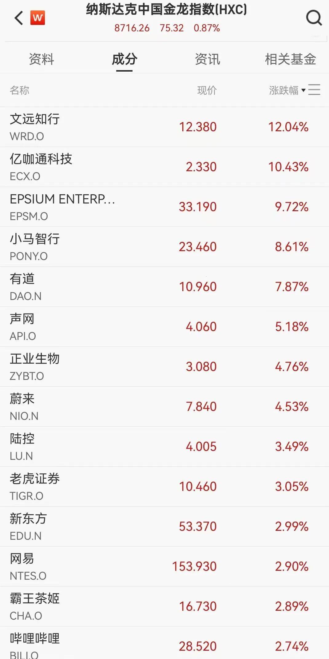 热门中概股全线走高,文远知行涨近12%,小马智行涨超8%,蔚来涨逾4%。