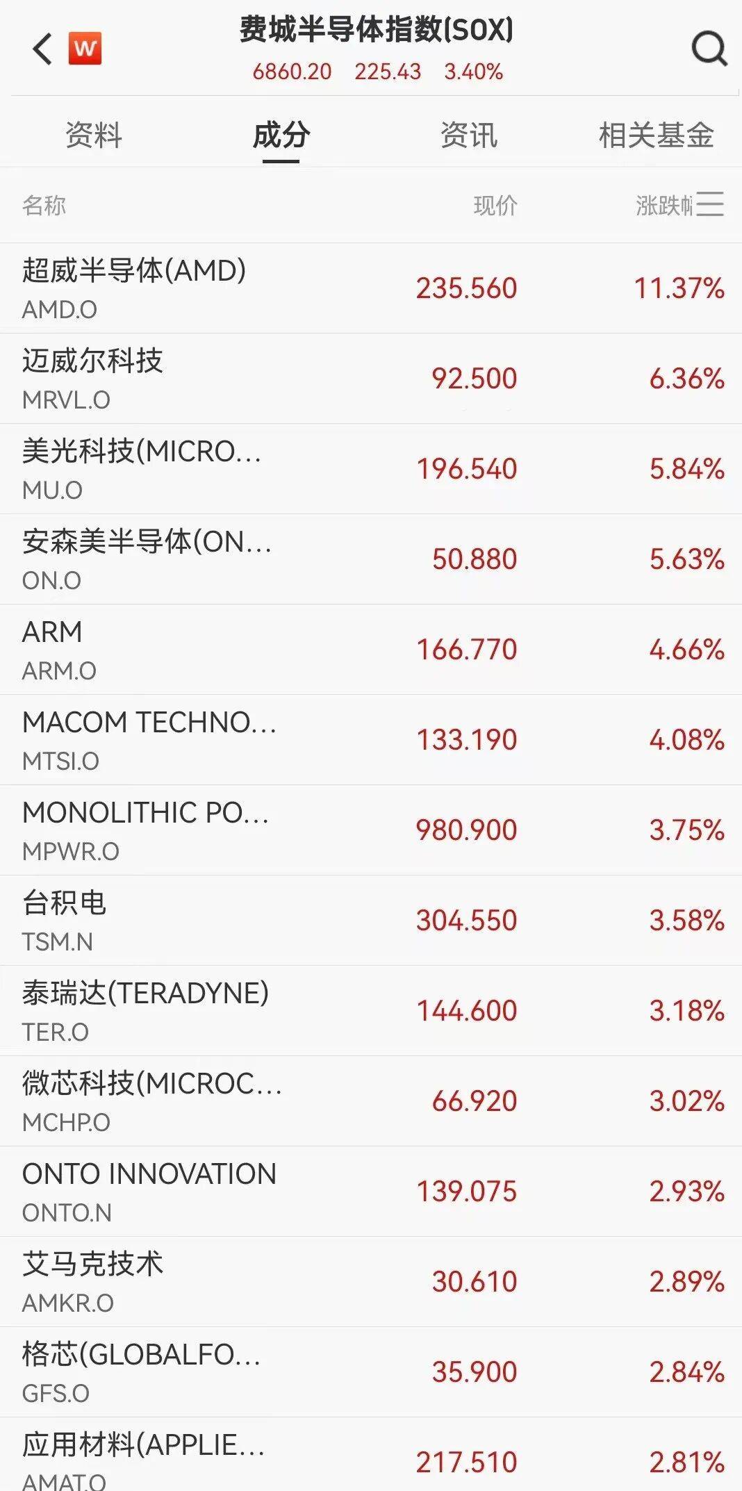 此外,以半导体为主的科技板块集体大涨。费城半导体指数暴涨超3%。