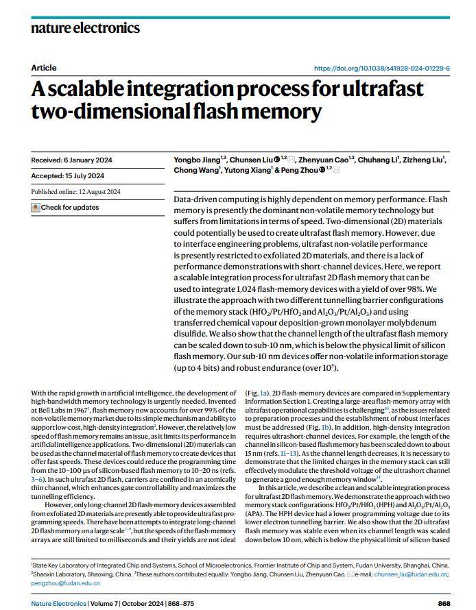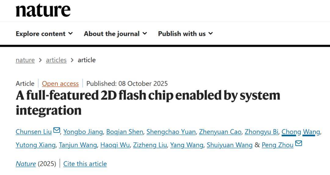 相关研究成果以《全功能二维-硅基混合架构闪存芯片》(A full-featured 2D flash chip enabled by system integration)为题于北京时间 10 月 8 日晚间在《自然》(Nature)期刊上发表。