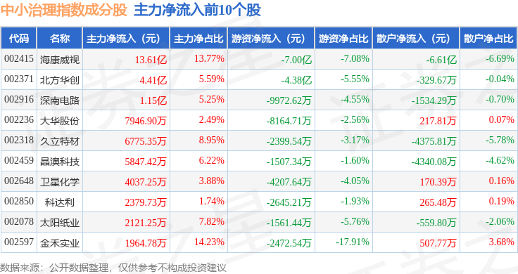 资金流向方面,中小治理(399650)指数成份股当日主力资金净流出合计2.18亿元,游资资金净流出合计4.13亿元,散户资金净流入合计6.31亿元。成份股资金流向详情见下表:
