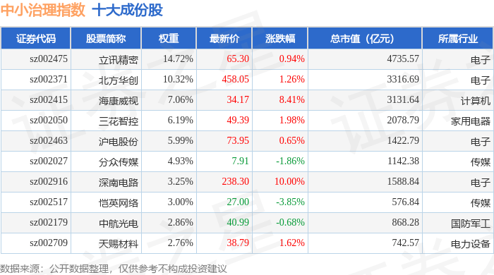 证券之星消息,10月9日,中小治理(399650)指数报收于2752.76点,涨1.62%,成交853.71亿元,换手率2.32%。当日该指数成份股中,上涨的有33家,深南电路以10.0%的涨幅领涨,下跌的有16家,恺英网络以3.85%的跌幅领跌。